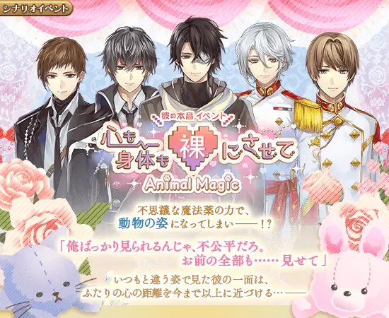 11月25日(月)16時よりアプリ内にてシナリオイベント「心も身体も裸にさせて~Animal Magic~」の開催が決定しました。本イベントではヨナ=クレメンス(CV.花江 夏樹)、エドガー=ブライト(CV.八代 拓)、レイ=ブラックウェル(CV.下野 紘)、シリウス=オズワルド(CV.諏訪部 順一)、セス=ハイド(CV.村田 太志)、ハール=シルバー(CV.寺島 惇太)、オリヴァー=ナイト(CV.濱野 大輝)、ディーン=トゥイードル(CV.和田 雅成)、ダム(ダリム=トゥイードル)(CV.安里 勇哉)が登場します。