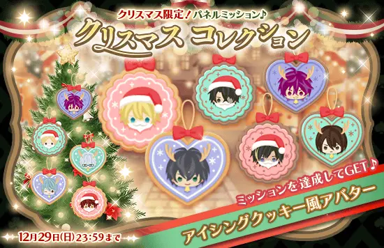 12月9日(月)16時より、アプリ内にてクリスマス限定パネルミッション「クリスマスコレクション」を開催しました。達成したパネルの枚数に応じて、限定彼ぐるみアバターやアプリ内アイテムが貰えます。