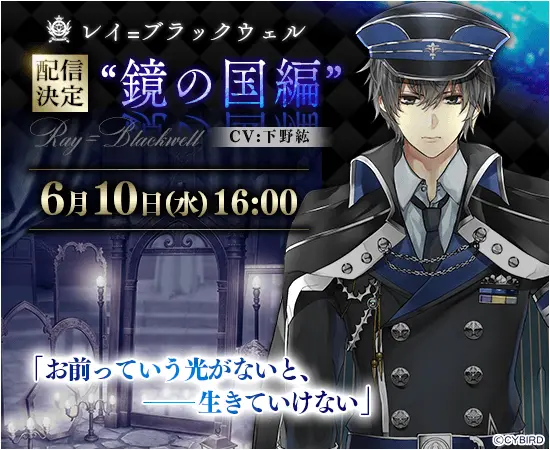 6月10日(水)16時より、『不思議の国編』に引き続き、黒のK・「レイ=ブラックウェル」(CV.下野紘)の『鏡の国編』ストーリーを配信いたします。合わせて5月25日(月)16時よりアプリ内で特設ページがオープンいたしました。