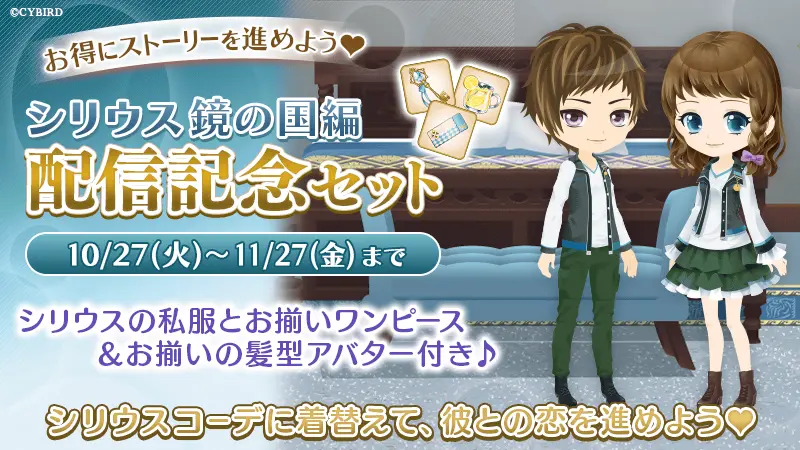 「シリウス=オズワルド」の「鏡の国編」配信を記念して、彼とお揃いワンピースアバターが入った豪華セット「シリウス鏡の国編配信記念セット ゴールド」/3,500円や、彼と瞳と同じ色の髪型アバターがセットの「シリウス配信記念セット シルバー」/1,400円の販売もアプリ内スタート。さらに、既に配信されている本編配信記念セットも復刻販売いたします。