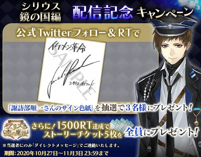 期間中に『イケメン革命◆アリスと恋の魔法』公式Twitterをフォロー&RTした方の中から、抽選で3名様に【諏訪部 順一さんのサイン色紙】が当たるRTキャンペーンを開催中です。