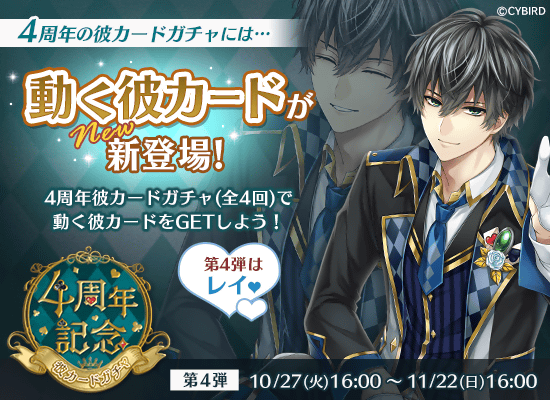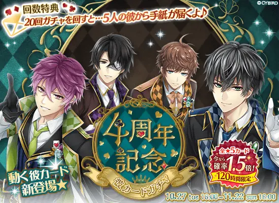 アプリ内にて、「4周年記念彼カードガチャ」の第4弾を開催がスタートします。開始から120時間限定で、全★5カードの排出確率が1.5倍になります。
