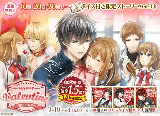 アプリ内にて、「Happy Valentine彼カードガチャ」を2月12日(金)より開催します。開始から120時間限定で、全★5カードの排出確率が1.5倍になります。