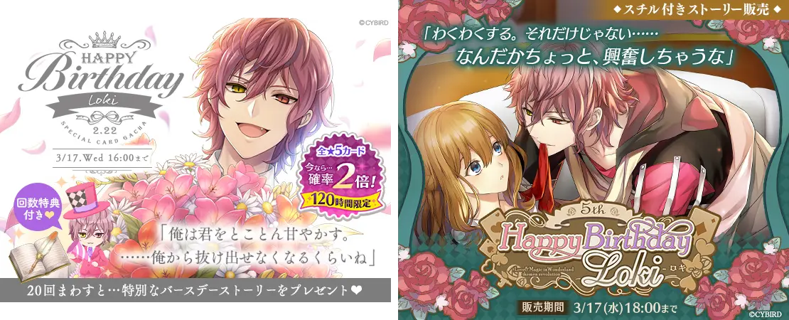チェシャ猫「ロキ=ジェネッタ」(CV. 村瀬 歩)の誕生日をお祝いする「HappyBirthdayLoki!!限定彼カードガチャ」、スチル付きストーリー販売「Happy Birthday Loki~5th~」を開催します。