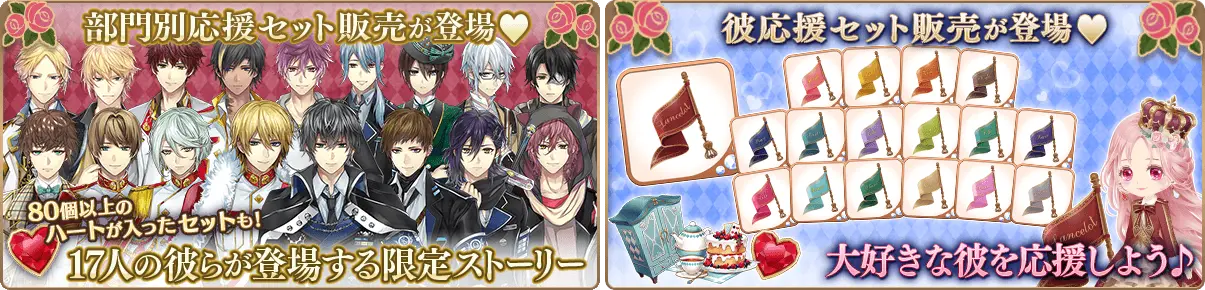 彼らカラーのチアリングフラッグアバターやハート・ティーセットなどが入ったお得な彼応援セット販売や、ノミネートされた部門ごとの特別ストーリーが入った部門別ストーリーセットが同時販売中です。