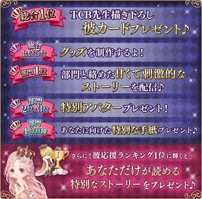 特定のキャラクターにどれだけ「ハート」を贈ったかを競うユーザーランキングである、「彼応援ランキング」No.1~No.3、TOP10位、30位、50位に輝くと、限定ミニキャラアバターが獲得できます。「彼応援ランキング」No.1~No.3の方には、後日お名前を入れた世界に一つだけのアバターとしてプレゼントします。