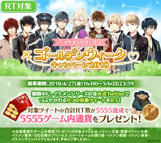 期間中にイケメンシリーズの各公式Twitterでつぶやかれる対象ツイートをRTしよう!詳細は各タイトルのアプリ内キャンペーンページをチェックしてね!