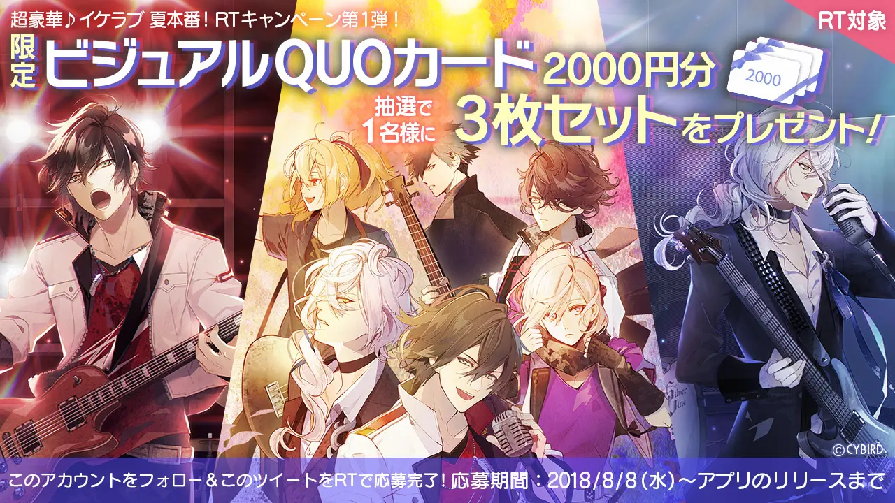 現在、「超豪華♪イケラブ夏本番!RTキャンペーン」の第1弾を実施中です。本アプリの公式Twitterをフォローの上、対象ツイートをリツイートしていただくと、限定ビジュアルQUOカード2,000円分3枚セットを、抽選で1名様にプレゼントします。第2弾以降の豪華プレゼントキャンペーンも、続々開催予定です。
