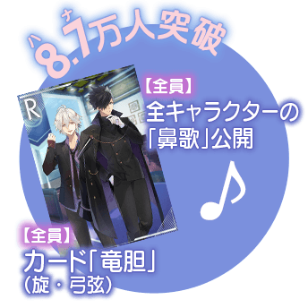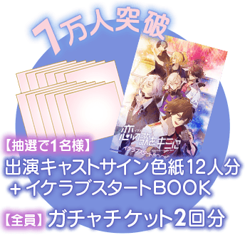- ・ギフトカード、ならびに出演キャストサイン色紙12人分+イケラブスタートブックの特典は、Twitterで事前登録をされたお客様の中から抽選でのプレゼントとなります。当選者は、日本国内にお住まいの方で、かつ賞品のお届け先が日本国内の方に限らせていただきます。また、当選の発表は賞品の発送をもってかえさせていただきます。 全キャラクターの「鼻歌」特典は、公式サイト上で公開いたします。