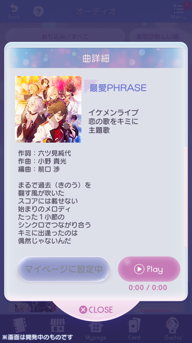 ストーリー中に流れる歌やBGMを、マイページに設定できるよ。 他イケメンシリーズの曲も登場予定!