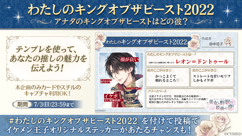 作った画像を「#わたしのキングオブビースト2022」をツイート内につけて投稿すると、抽選で10名にイケメン王子オリジナルステッカーがあたるチャンスも!