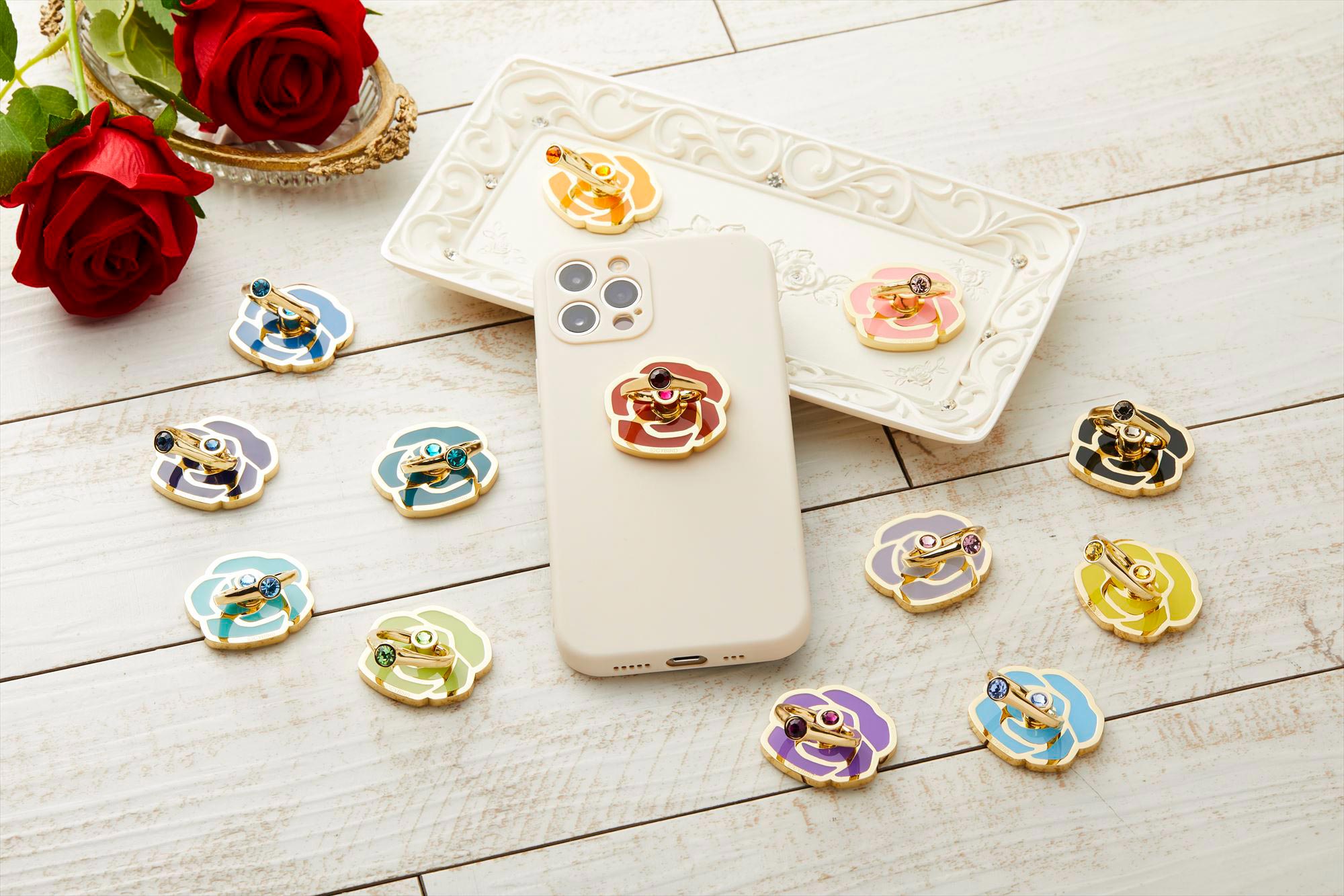 作品に登場する「薔薇」をイメージした土台と、まるで指輪のようなデザインのリング。リングの上部では、キャラクターカラーの大粒のクリスタルが輝きます。