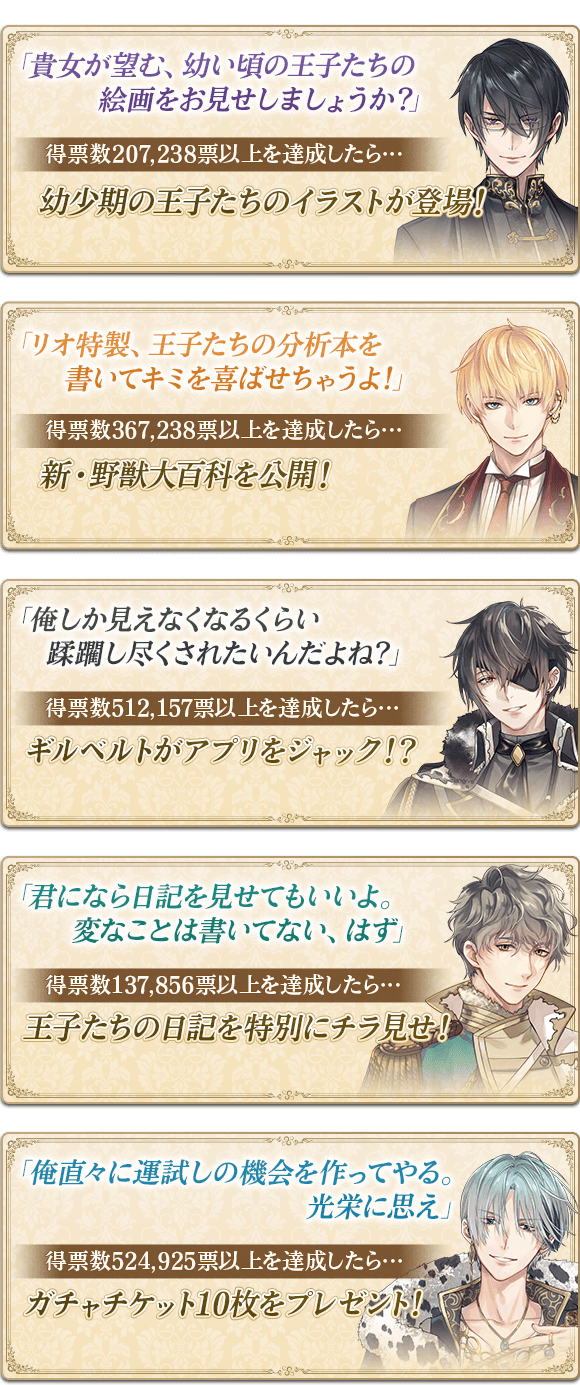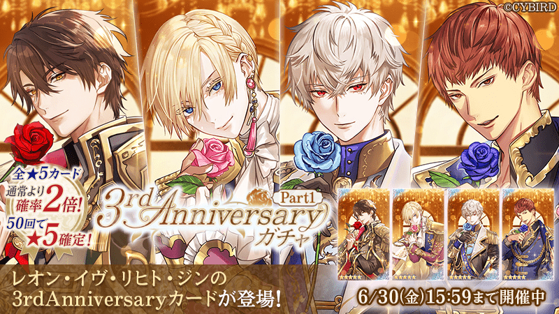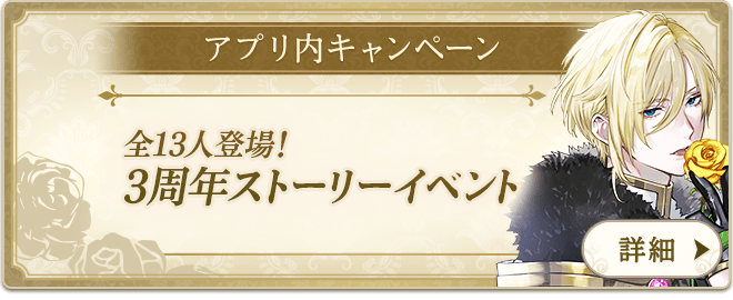 3周年を記念したストーリーイベント「3周年イベント~美女が叶える野獣の夢~」では、全13人の彼がPart1~3に分かれて登場します。