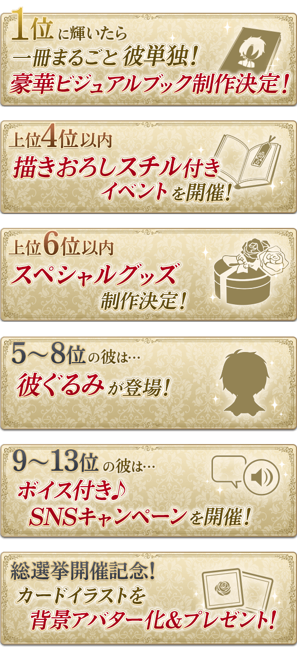 本総選挙では、総投票数を競う「総合ランキング」の他に、全13キャラクターが3チームに分かれてそれぞれの票数をチーム単位で競う「チームランキング」があります。総合ランキング1位のキャラクターは、豪華ビジュアルブックを作成!ランキングの順位に応じて、豪華な企画が実施されます。