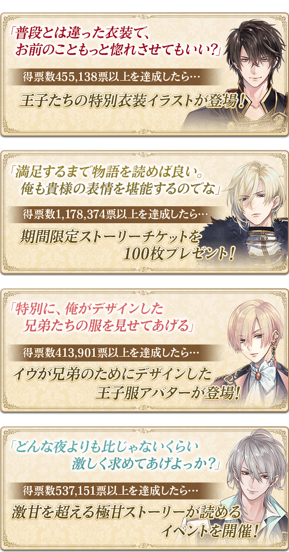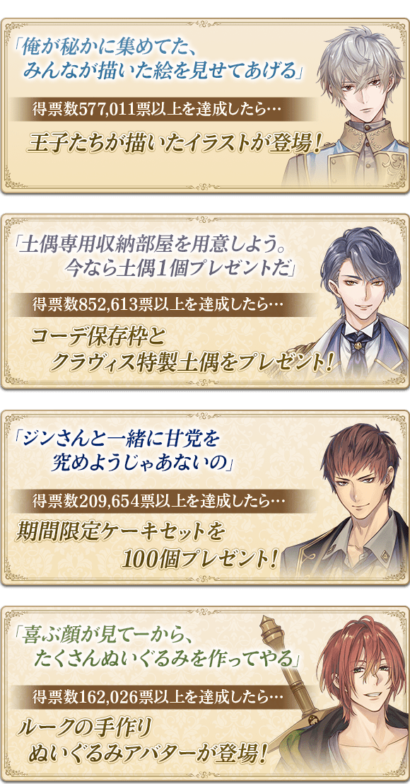 本編ストーリーを読み進めたり、ミニゲームをプレイすると、「投票券」を獲得することができます。また、投票数に応じて、豪華な特典ももらえます。