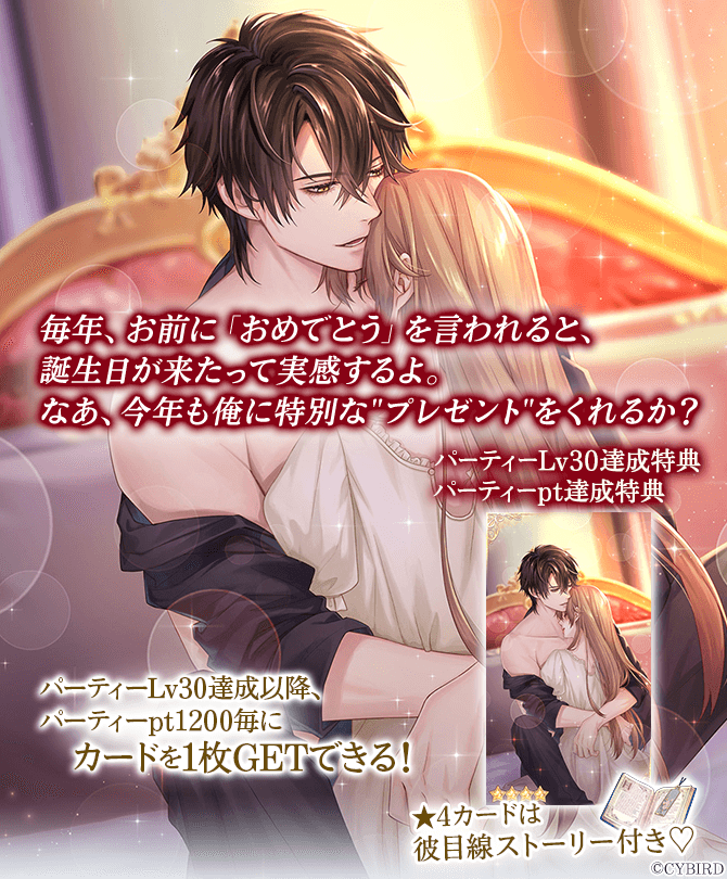 今回のイベントストーリーでは彼の本編ストーリー・真実の愛ENDの続きとなるストーリーが展開され、SweetENDは主人公目線、PremiumENDとエピローグは彼目線で綴られます。