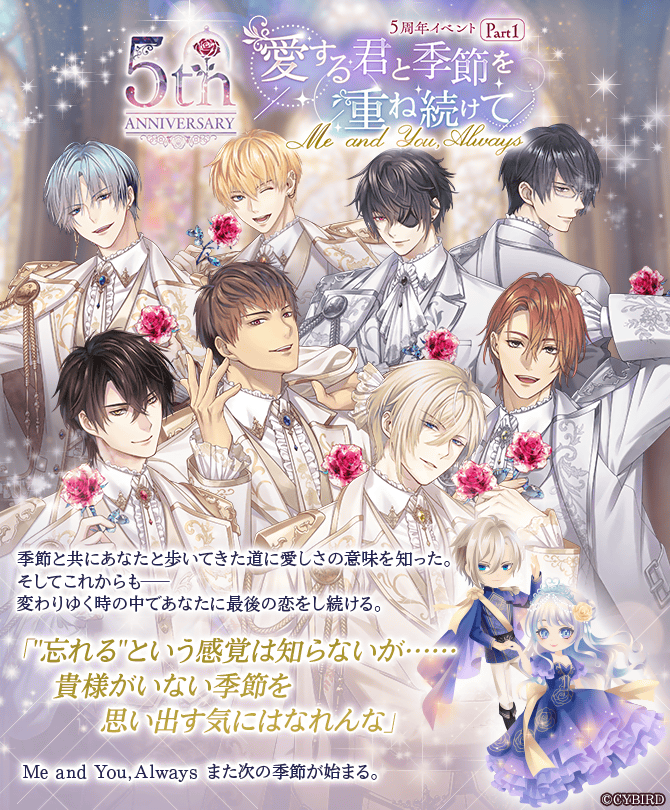 5周年を記念したストーリーイベント「Me and You, Always~愛する君と季節を重ね続けて~」では、全16人の彼がPart1~2に分かれて登場します。