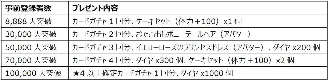 『イケメン王子 美女と野獣の最後の恋』の公式サイト、公式LINE、公式Twitter、イケメンシリーズファンクラブのいずれかにおいて事前登録頂いたお客様に向けたキャンペーンを開催致します。事前登録者数に応じて総計で、10回分のガチャチケットや、5000円以上相当の豪華アイテムがもらえる事前登録2大キャンペーンを実施します。1. 事前登録者数 プレゼント内容