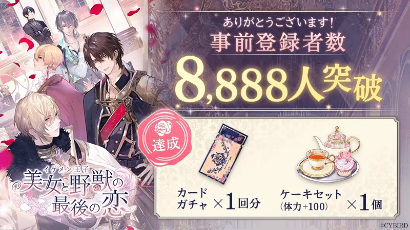 8,888人突破の特典として、「カードガチャ1回分」と「ケーキセット(体力回復)1個」のプレゼントが決定致しました。3万人突破でさらに豪華特典がもらえる♪