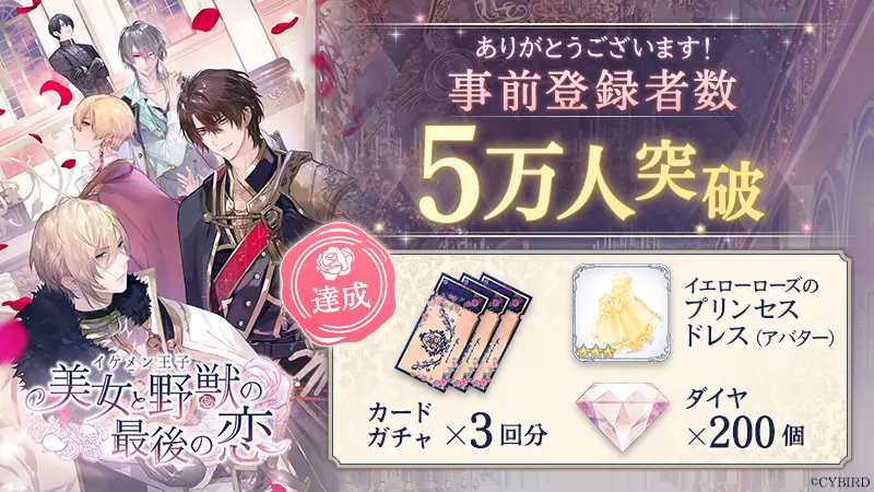 すでに確定していた8,888件・3万件達成の褒賞に加えて、5万件達成での褒賞となっていた「カードガチャ3回分」、「イエローローズのプリンセスドレス(アバター)」「ダイヤx200個」といったゲーム内アイテムのプレゼントも確定しました。