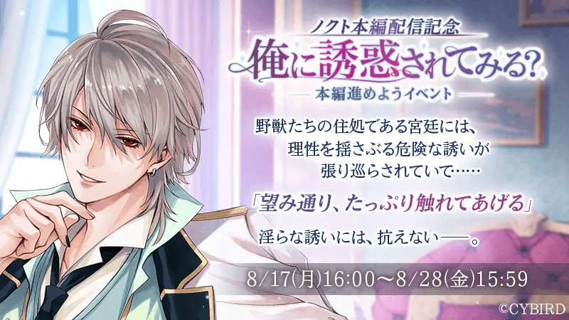 「ノクト=クライン」本編ストーリー配信に記念して、アプリ内では本編進めようイベント「俺に誘惑されてみる?」を、2020年8月17日(月)16時から8月28日(金)15時59分まで開催します。