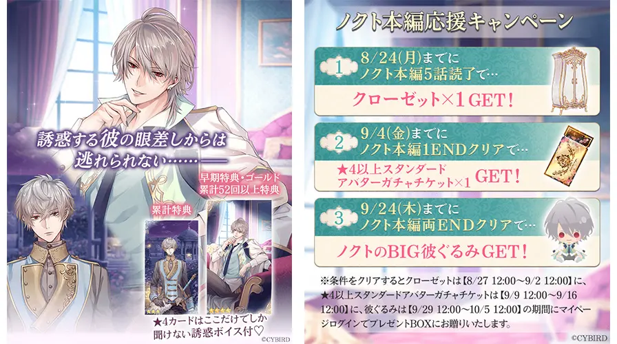 またこの期間に「ノクト=クライン」本編応援キャンペーンも実施いたします。ストーリーを読み進めて条件をクリアすることで、豪華特典が取得できます。