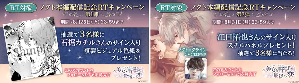 「ノクト=クライン」本編配信を記念して、『イケメン王子 美女と野獣の最後の恋』の公式Twitter(https://twitter.com/CYikemenprince)にて、キャラクター原案を担当した石据 カチルさんのサイン入り複製イラストや、江口 拓也さん直筆サイン入りスチルパネルをプレゼントするキャンペーンを実施します。