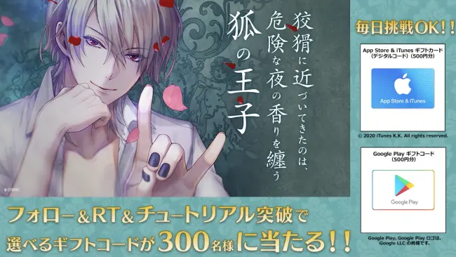 公式Twitterをフォロー&該当ツイートをRT、アプリ内のお知らせから参加することで、抽選で300名様にApp Store & iTunes ギフトカード(デジタルコード)または、Google Play ギフトコードが選べるギフトコード500円分をプレゼント致します。その場ですぐ抽選結果がわかります。開催期間:2020年8月21日(金)~8月24日(月)