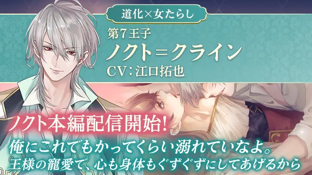 江口 拓也さんがCVを務める、”道化×女たらし”第7王子「ノクト=クライン」の本編ストーリーの配信が開始しました。「ノクト=クライン」本編のあらすじをお楽しみいただける、本編ダイジェストPVは絶賛公開中です。<本編あらすじ>