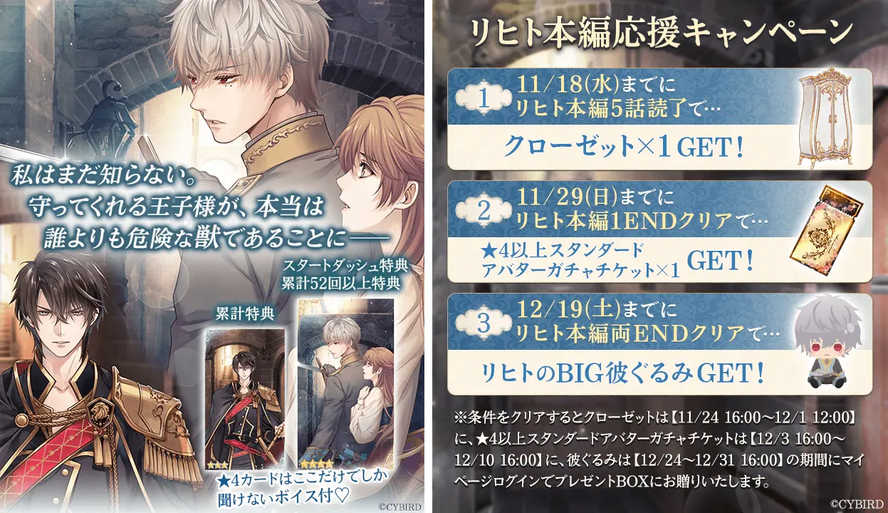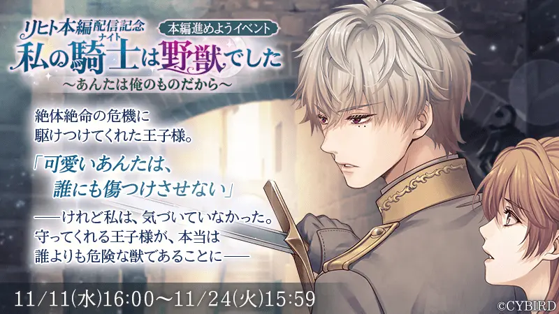 「リヒト=クライン」本編ストーリー配信を記念して、アプリ内では本編進めようイベント「私の騎士は野獣でした」を、2020年11月11日(水)16時から11月24日(火)15時59分まで開催します。