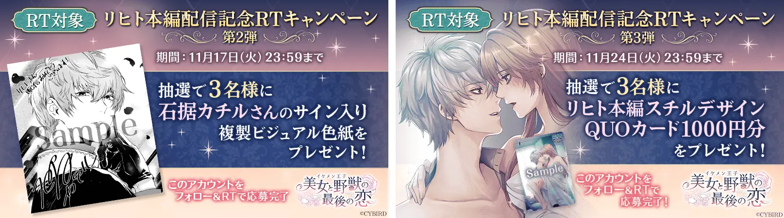 「リヒト=クライン」本編配信を記念して、『イケメン王子 美女と野獣の最後の恋』の公式Twitter(https://twitter.com/CYikemenprince)にて、キャラクター原案を担当した石据 カチルさんのサイン入り複製イラストや、リヒトの本編スチルデザインのQUOカードをプレゼントするキャンペーンを実施します。第二弾開催期間: