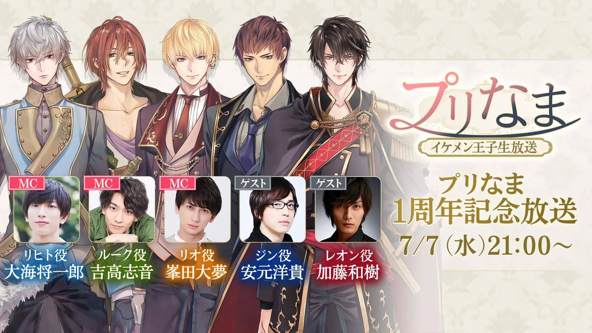 『イケメン王子 美女と野獣の最後の恋』1周年を記念した生放送番組「プリなま」の放送が、7月7日(水)21時より仮想ライブ空間SHOWROOM上で決定しました。MCは大海 将一郎さん(リヒト=クライン役)、吉高 志音さん(ルーク=ランドルフ役)、峯田 大夢さん(リオ=オルティス役)、ゲストに加藤 和樹さん(レオン=ドントゥール役)、安元 洋貴さん(ジン=グランデ役)を迎えてお送りします。