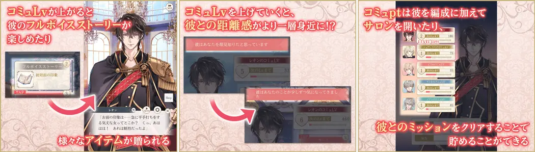 「コミュLV」を上げることで、彼との距離感が縮まり、より親密なフルボイスストーリーを読むことができます。フルボイスストーリーは、1キャラクターにつき10種類、全部で100種類を追加します。全10人のフルボイスストーリーをぜひお楽しみ下さい。