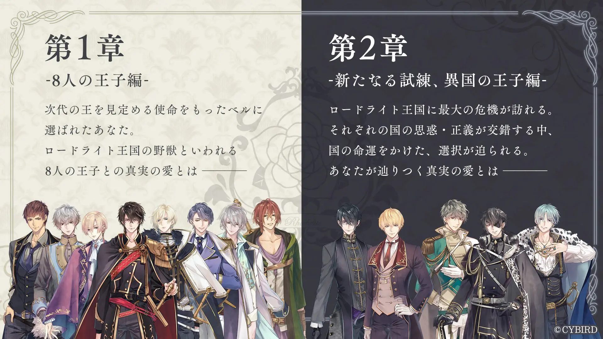 第1章は、次代の王を見定めるベルに選ばれたあなたとロードライト王国の8人の王子との物語。第2章では、隣国の3国の王子である新キャラクター「ギルベルト」「キース」「シルヴィオ」がロードライト王国に最大の危機をもたらします。それぞれの国の思惑と正義が交錯する中、国の命運をかけた選択を迫られて……。