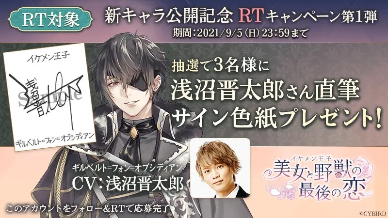 新キャラクター3人の担当キャスト発表を記念して、『イケメン王子 美女と野獣の最後の恋』公式Twitter(https://twitter.com/CYikemenprince)にて、浅沼 晋太郎さん、佐藤 拓也さん、羽多野 渉さんの直筆サイン色紙が当たるプレゼントキャンペーンを実施します。アカウントをフォロー&該当のツイートをRTすると応募することができます。