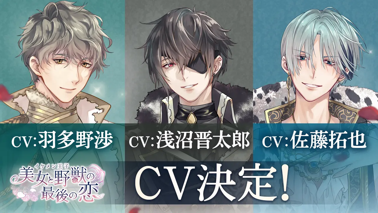 『イケメン王子 美女と野獣の最後の恋』は、8月22日(日)に実施されたオンラインイベントで、3名の新キャラクターのビジュアルとキャストの発表PVを公開しました。キャストを務めるのは、浅沼 晋太郎さん、羽多野 渉さん、佐藤 拓也さんら豪華声優陣です。3名の新キャラクターは、2021年冬より始動する第2章より正式に登場します。
