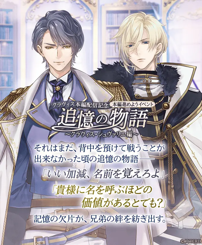 野島 健児さんがCVを務める、”ミステリアス×不敵”第3王子「クラヴィス=ルルーシュ」の本編ストーリーの配信が開始しました。「クラヴィス=ルルーシュ」本編のあらすじをお楽しみいただける、本編ダイジェストPVは絶賛公開中です。本編ダイジェストPV: