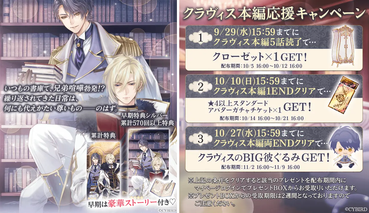 またこの期間に「クラヴィス=ルルーシュ」本編応援キャンペーンも実施します。ストーリーを読み進めて条件をクリアすることで、豪華特典が取得できます。開催期間:2021年9月22日(水)16:00 ~ 10月1日(金)15:59