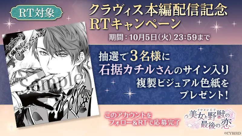 「クラヴィス=ルルーシュ」本編配信を記念して、『イケメン王子 美女と野獣の最後の恋』の公式Twitter(https://twitter.com/CYikemenprince)にて、キャラクター原案を担当した石据 カチル先生のサイン入り複製イラストをプレゼントするキャンペーンを実施します。開催期間:2021年9月22日(水)19:00~10月5日(火)23:59