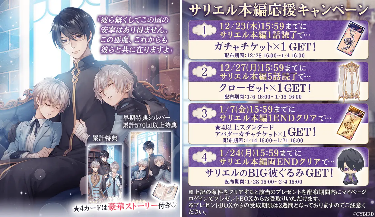 また以下の期間に「サリエル=ノワール」本編応援キャンペーンも実施します。ストーリーを読み進めて条件をクリアすることで、豪華特典が取得できます。■開催期間:~ 2022年1月24日(月)15:59