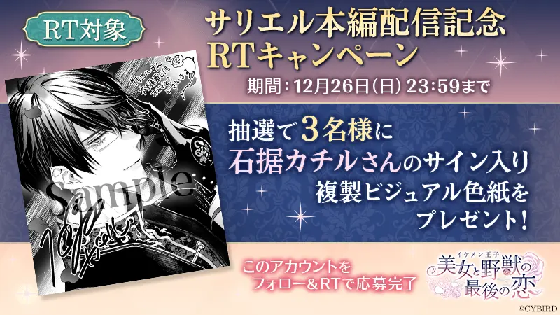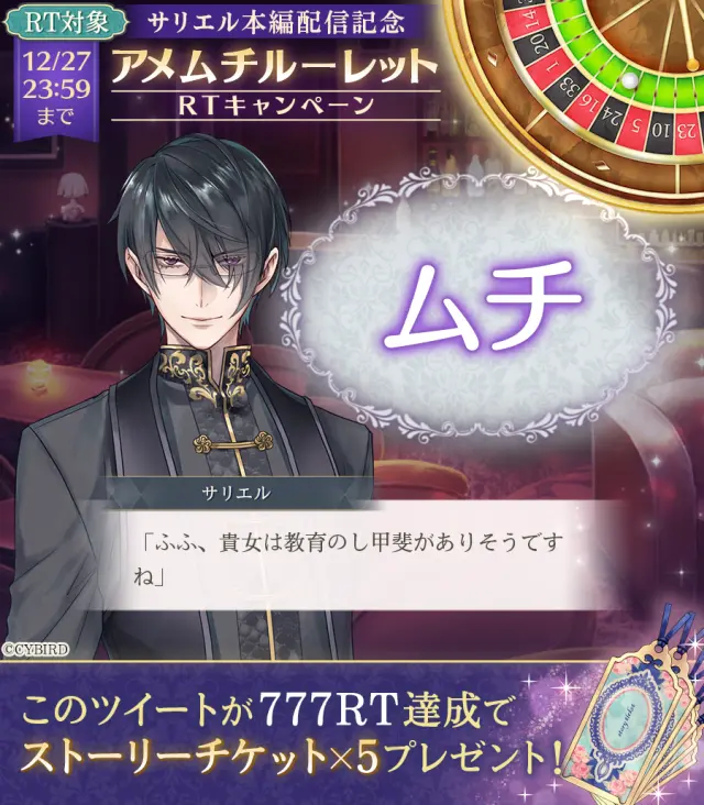 「サリエル=ノワール」本編配信を記念して、『イケメン王子 美女と野獣の最後の恋』の公式Twitter(https://twitter.com/CYikemenprince)にて、サリエルをはじめとした王子達があなたの運勢を占う、アメムチルーレットキャンペーンを実施します。777RT達成でストーリーチケット×5をプレゼント!