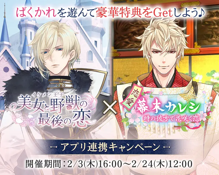 『イケメン王子 美女と野獣の最後の恋』は、フリュー株式会社の恋愛シミュレーションゲーム『恋愛幕末カレシ~時の彼方で花咲く恋~』とのコラボキャンペーンを、2月3日(木)より開催します。