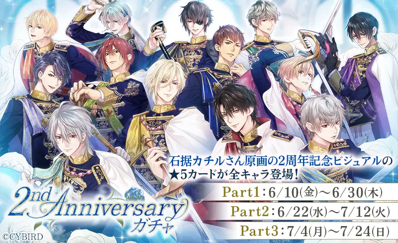 キャラクター原案を担当した石据カチルさん原画の2周年記念ビジュアルが、全13種の★5カードになって期間限定ガチャに登場します。