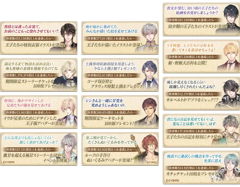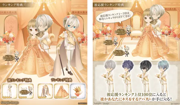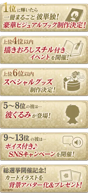 本編ストーリーを読み進めたり、ミニゲームをプレイすることで、“投票券”が獲得でき、気になる彼に投票ができます。また、投票数に応じて豪華な特典を獲得できます。