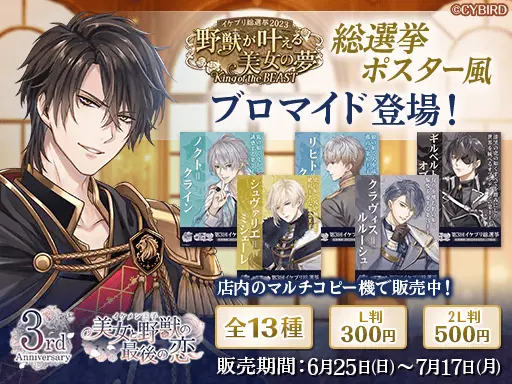 「イケプリ総選挙2023 野獣が叶える美女の夢~King of the BEAST~」の開催を記念し、総選挙ポスター風ブロマイドが「ローソンプリント」に登場します。お気に入りの彼のブロマイドを手に入れて、ぜひ総選挙を応援してください。