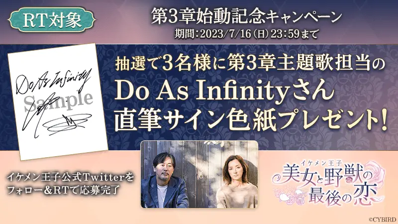 『イケメン王子 美女と野獣の最後の恋』の公式Twitter(https://twitter.com/CYikemenprince)では第3章の始動を記念したキャンペーンを開催します!