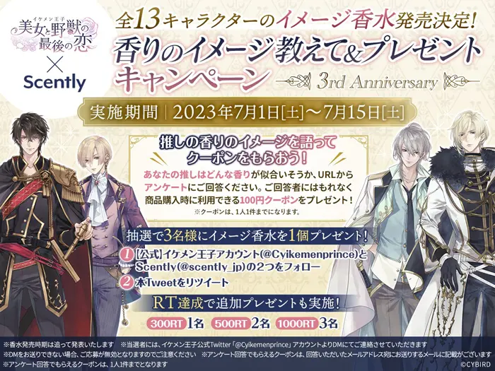 ※クーポンは、1人1件までになります。さらに!『イケメン王子 美女と野獣の最後の恋』公式Twitterと「Scently」公式Twitterをフォローの上、対象ツイートをリツイートしていただいた方の中から抽選で最大3名様に、ご希望の彼のイメージ香水を1個プレゼントします。