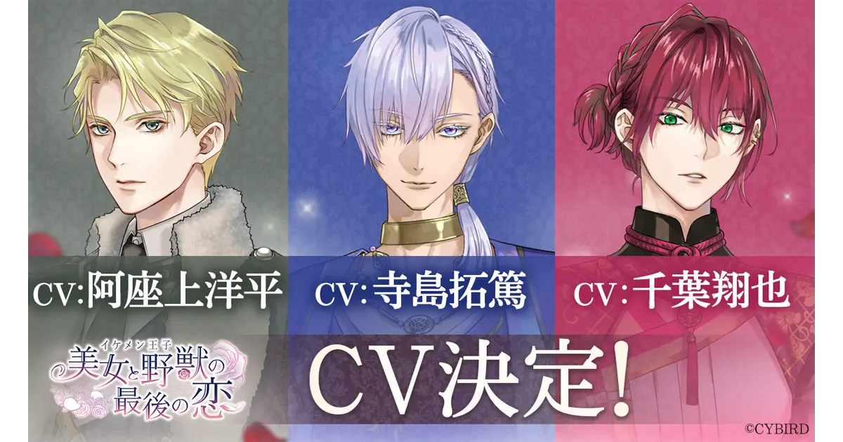 『イケメン王子 美女と野獣の最後の恋』は、3名の新キャラクター、「アゼル=ラドワーン(CV: 寺島 拓篤)」、「マティアス=オースブリンク(CV: 阿座上 洋平)」、「カガリ=アマガセ(CV: 千葉 翔也)」を2023年10月30日(月)に秋の夜長のPV鑑賞会で公開しました。