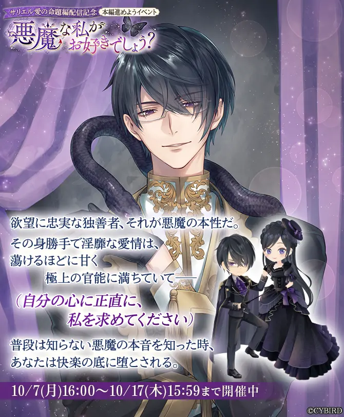「サリエル=ノワール」愛の命題編配信を記念して、アプリ内では本編進めようイベント「サリエル愛の命題編配信記念 悪魔な私がお好きでしょう?」を、開催しています。