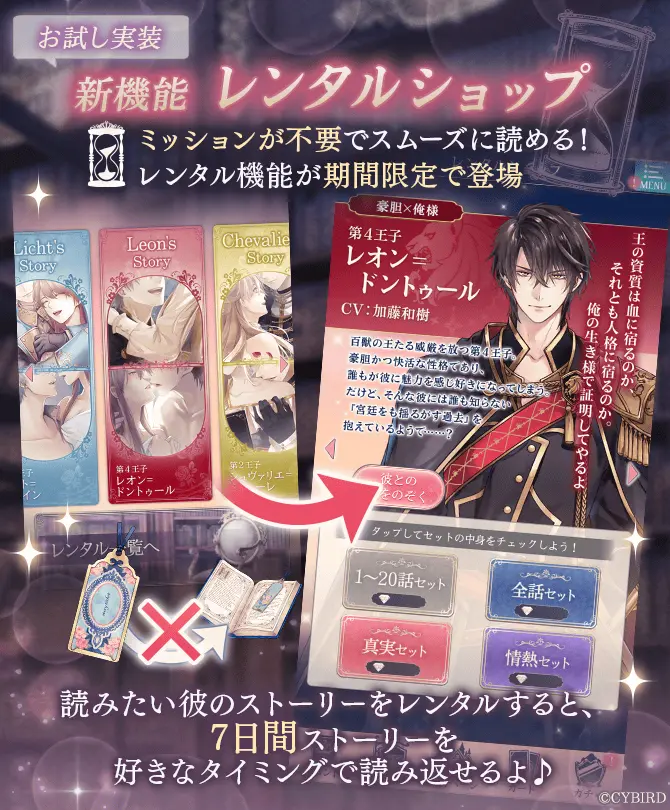 「レンタルショップ」では、メインストーリーをダイヤを消費してレンタルすることができます。レンタルした彼のストーリーは、レンタル開始から7日間、セットに含まれるストーリーを制限なく好きな箇所から読み返すことが可能です。